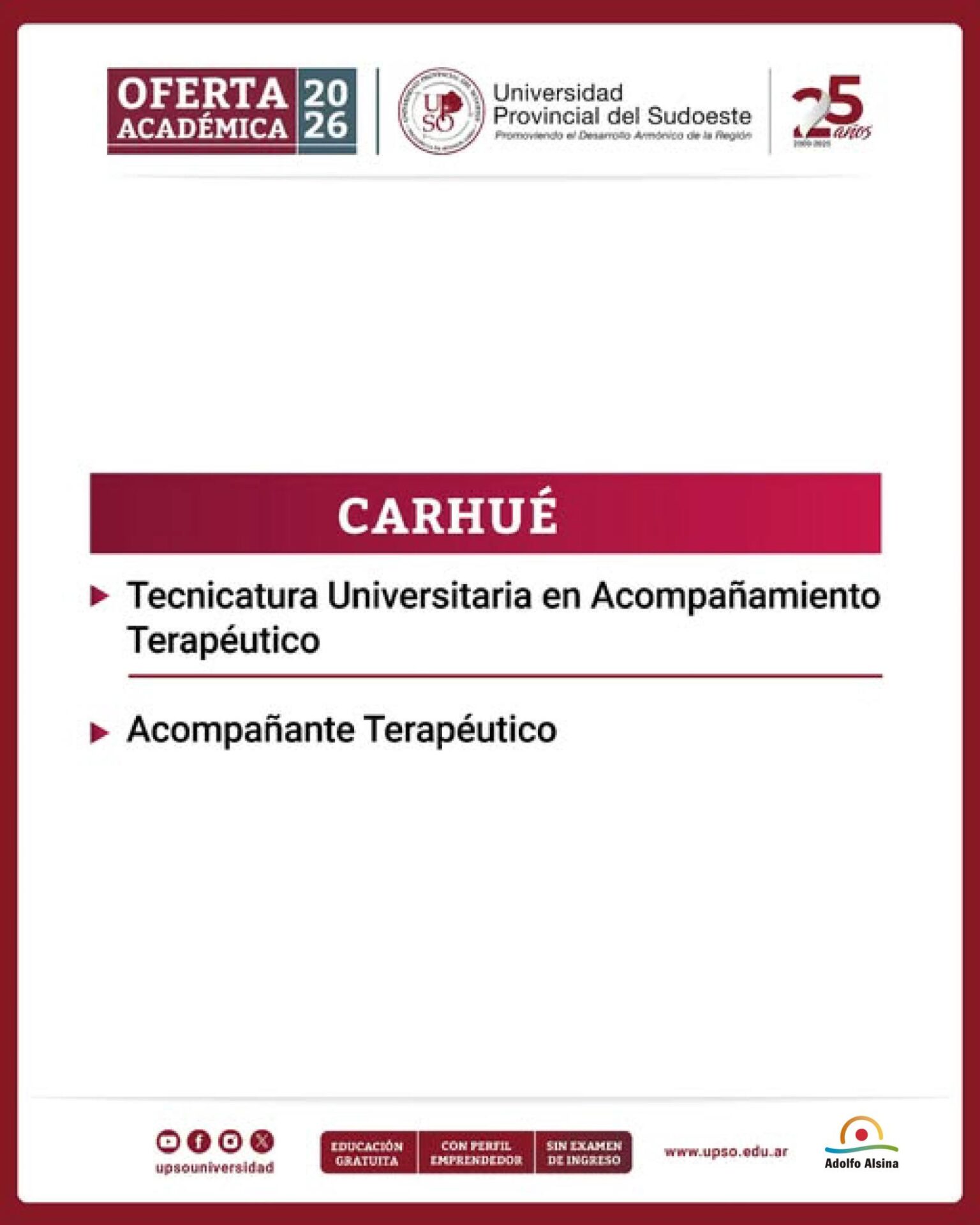CARHUÉGASCÓNLEUBUCÓRIVERASAN MIGUEL ARCÁNGELVILLA MAZA Avances en la gestión para reactivar las viviendas en Villa Maza Nueva oferta académica 2026 de la UPSO Jornadas Científicas Hospitalarias en Carhué Carhué dijo presente en la Feria Internacional de Turismo Andres con Álvarez Rodríguez: seguridad, educación y desarrollo El Barrio Arturo Illia celebra su 37° aniversario Ver más noticias
