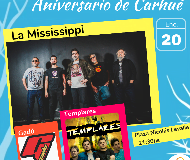 El domingo 20 de enero será la celebración principal del aniversario de Carhué que tendrá como Show Central a la Mississippi en el escenario mayor, ubicado frente al Palacio Municipal.