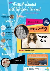 Del 1º al 3 de febrero se llevará a cabo la Fiesta Provincial del Turismo Termal. En su XVII edición contará con la presentación de Patricia Sosa como Show central el sábado 2 de febrero, a partir de las 23:30, en el escenario montado frente al Palacio Municipal de Carhué. Esa misma noche se realizará la elección de la Reina Provincial del Turismo Termal, el Show de Retropicante y la presentación de Marga Santiago.