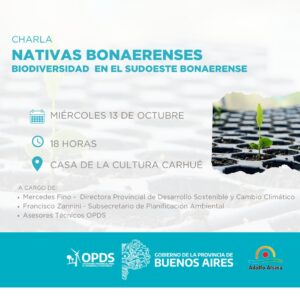 charla gratuita sobre «Nativas Bonaerenses. Biodiversidad en el Sudoeste Bonaerense» a cargo de Mercedes Fino, Directora Provincial de Desarrollo Sostenible y Cambio Climático; Francisco Zannini, Subsecretario de Planificación Ambiental; y asesores Técnicos OPDS.